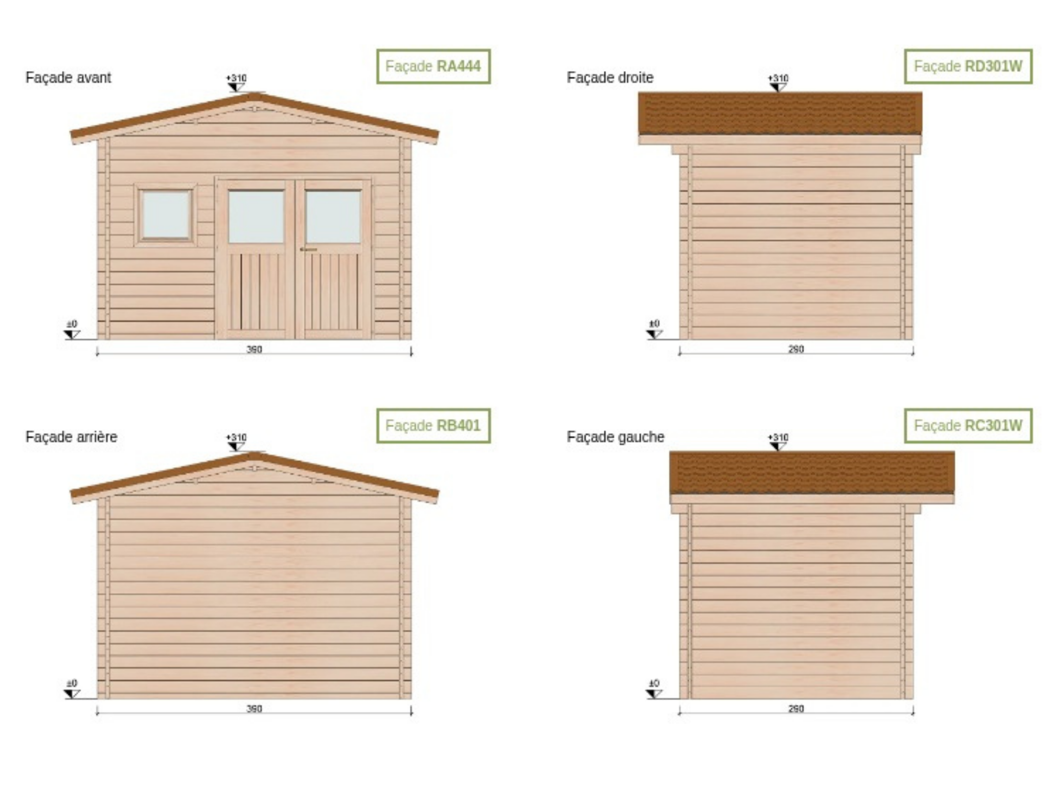 Nos chalets sont proposés dans leur version de base avec fenêtres et porte en bois. Toutefois, il y a une alternative comprenant des fenêtres en PVC à double vitrage et des portes sans soubassement, avec des cadres en PVC gris RAL 7016 à l’extérieur et blanc à l’intérieur.