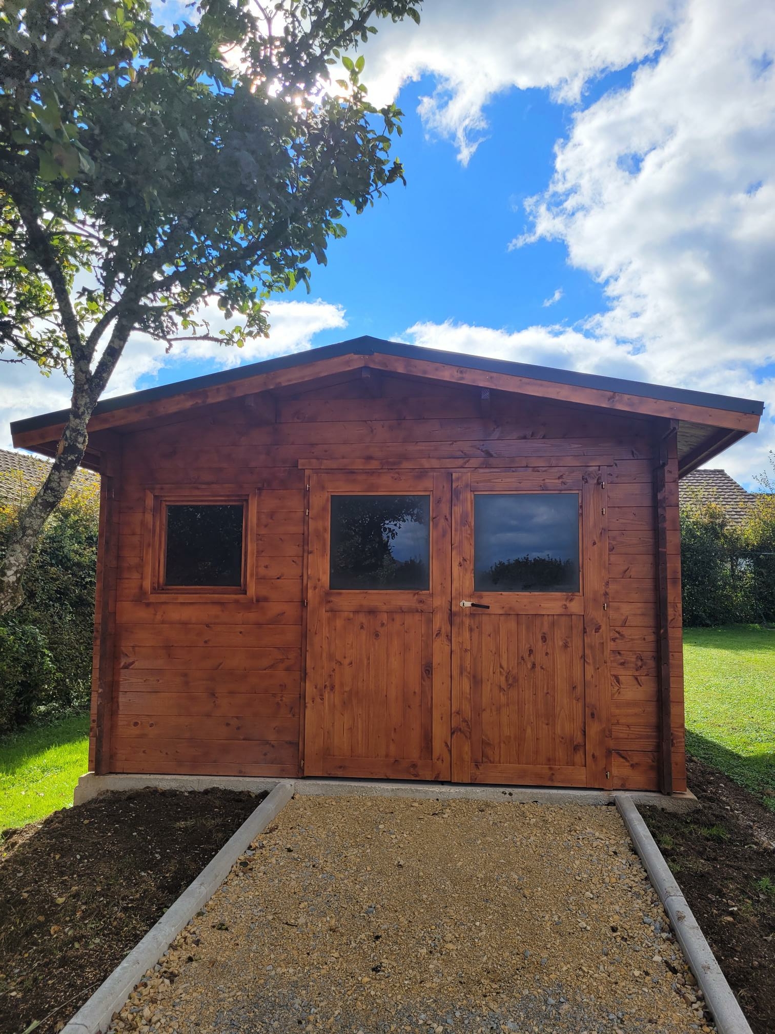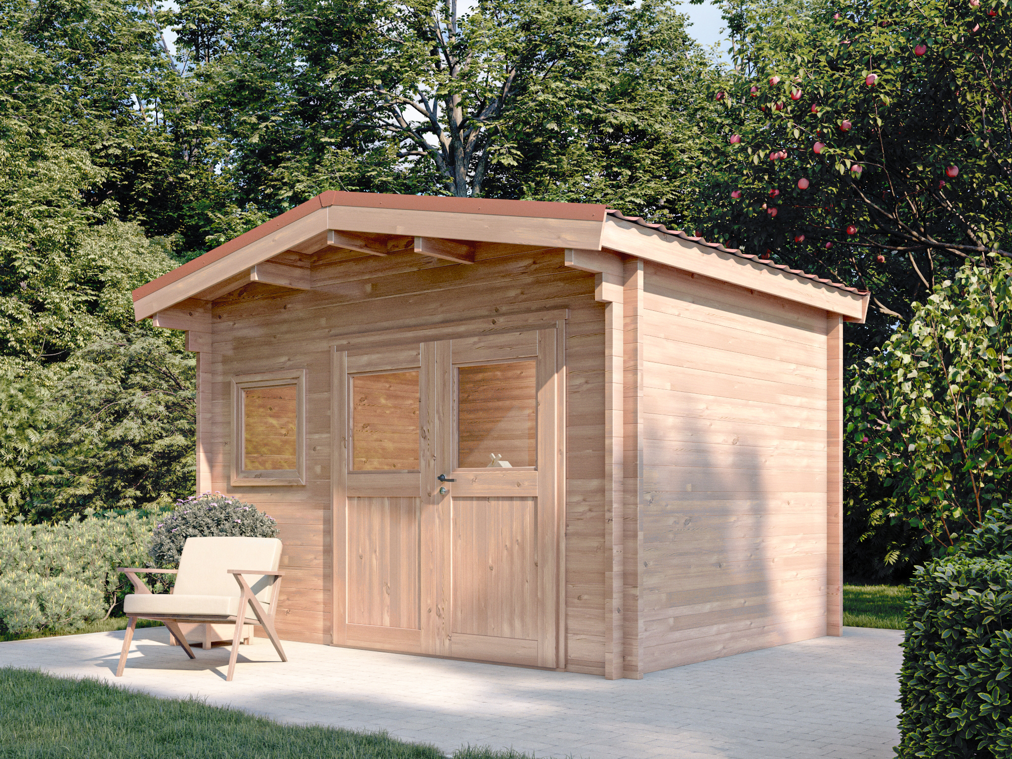 Le chalet le LANTENAY dispose d’une porte double et d’une fenêtre, assurant ainsi une luminosité intérieure optimale. Son toit pentu en acier (imitation tuiles rouges ou anthracites), renforce sa durabilité et sa résistance aux intempéries tout en lui conférant un design moderne. Sa structure en madriers massifs de 55 mm offre une isolation naturelle de qualité et une durabilité exceptionnelle.
